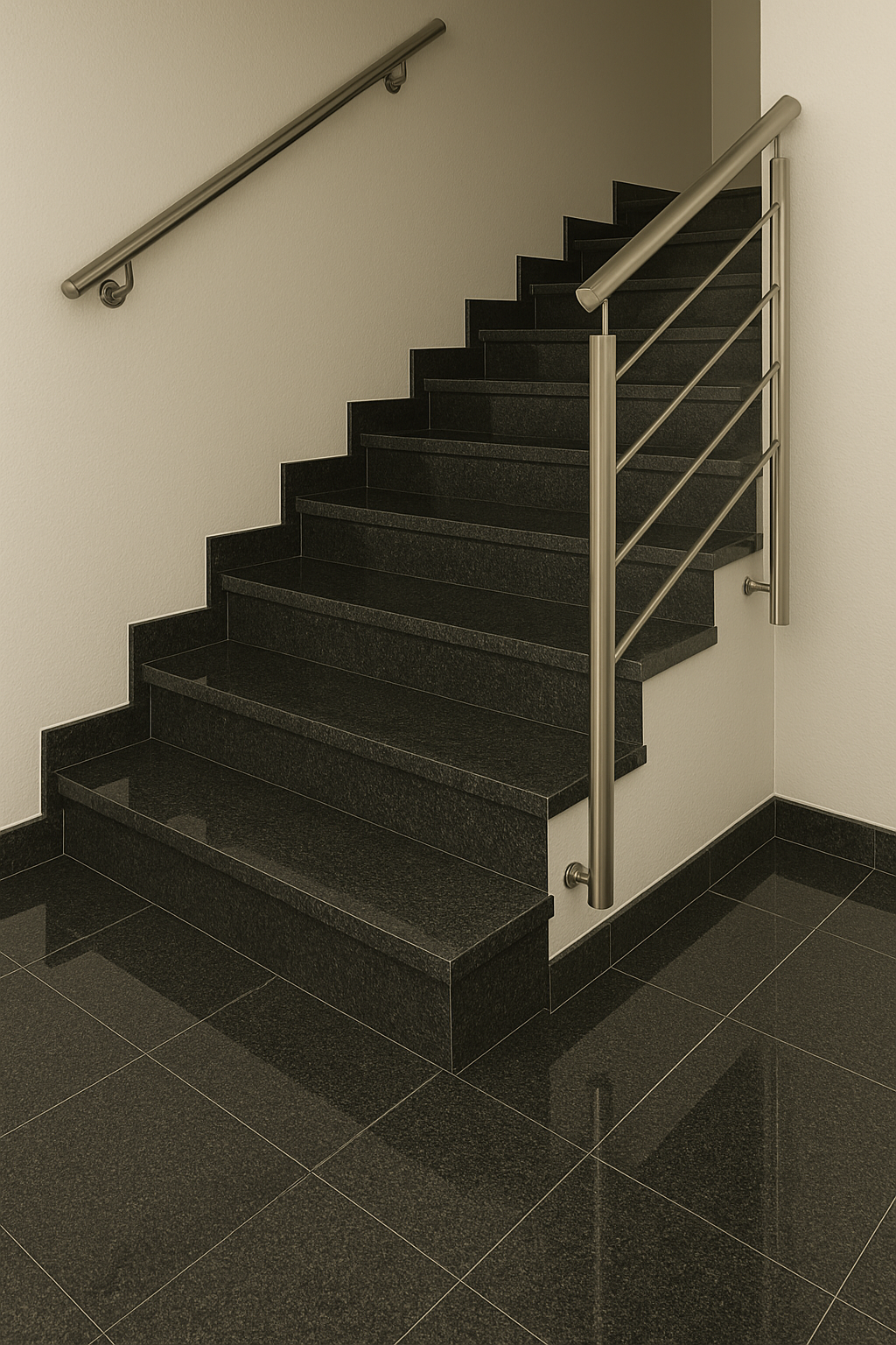 Dank ihrer polierten Oberfläche wirkt die Black Pearl Treppe besonders hochwertig und verleiht Treppenhäusern, Wohnbereichen oder gewerblichen Objekten eine unverwechselbare Note.