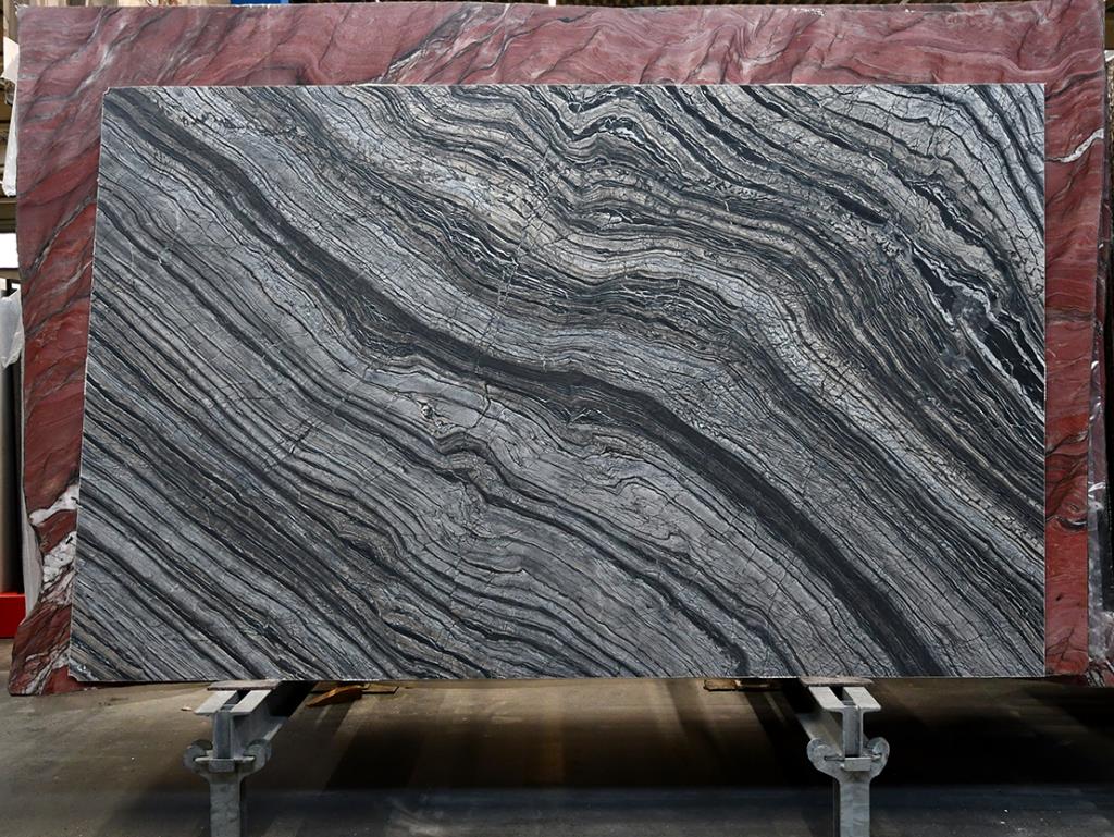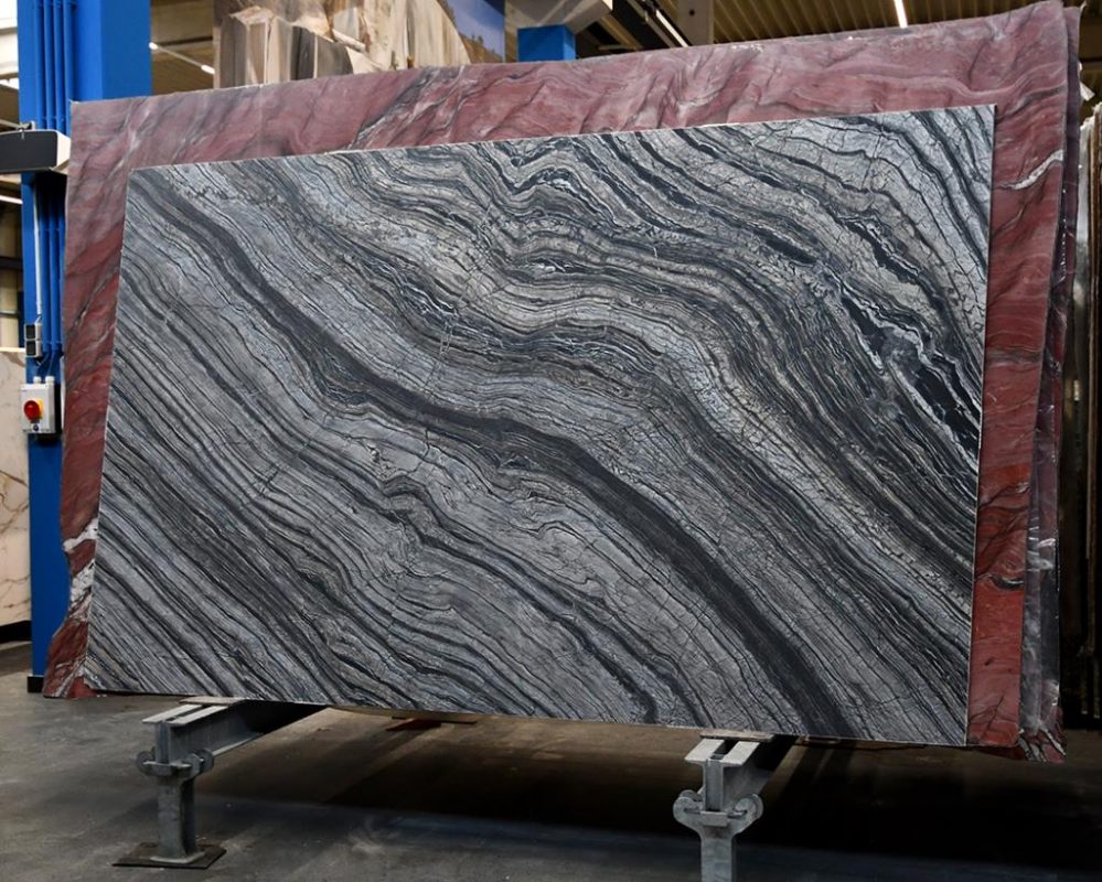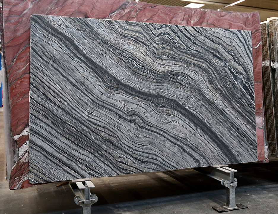 • Exklusive MaserungDunkler Kalkstein mit silberweißer Wellenstruktur