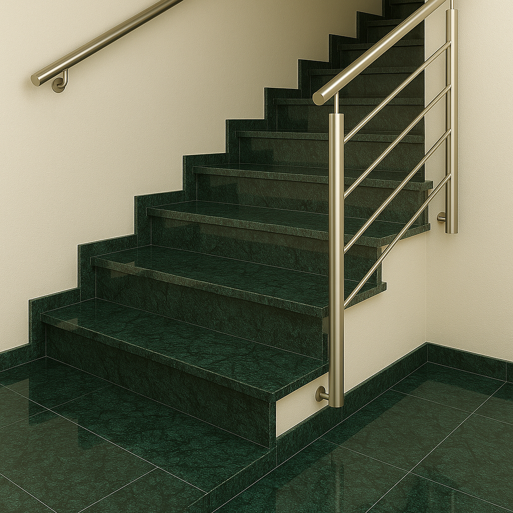 Ihre Verde Guatemala Treppe fertigen wir passgenau – ob gerade, halbgewendelt, voll gewendelt oder mit geschwungenen Zuschnitten. In Kombination mit Weiß, Gold, Messing oder dunklen Hölzern entsteht ein besonders luxuriöses Raumgefühl.